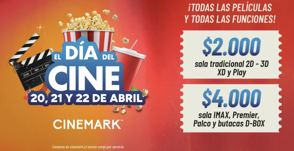 Este lunes 20, martes 21 y miércoles 22 de abril, Cinemark celebra el Día del Cine 2026, un evento que ofrece promociones exclusivas, con entradas a partir de los $2.000. La edición del Día del Cine 2026 cuenta, como cada año, con la participación de las cadenas Cineplanet, Cinépolis, Cinemark, Muvix y Cine Star, con películas como “ElDrama”, “Super Mario Galaxy: La Película”, el reestreno de “El Castillo Ambulante”, “Proyecto Fin del Mundo” y “Hoppers: Operación Castor”, entre otras.